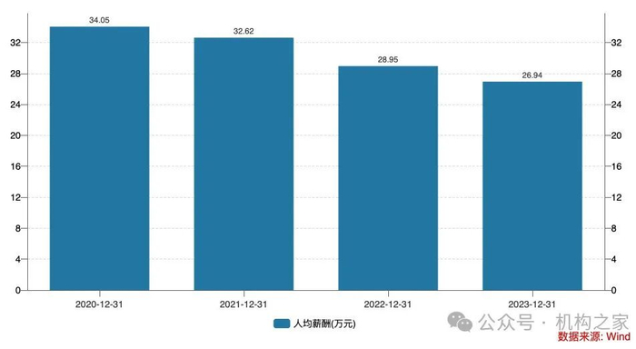 薪酬方面,Wind数据显示,赵万利2020年至2022年的年度薪酬分别为155.23万元、155.26万元和141.35万元,而2023年升任总经理后的薪酬提升至163.99万元。作为对比,华安证券人均薪酬自2020年的34.05万元降至2023年的26.94万元,下降幅度达20.88%。