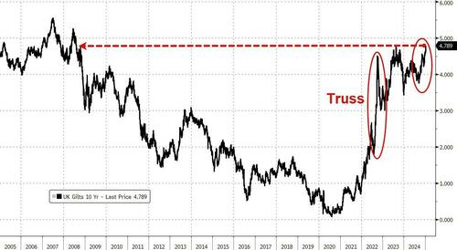 周三,10年期英国国债收益率最高涨至4.821%,为2008年8月以来的最高水平;英国30年期国债收益率则达到1998年8月以来的最高点5.383%,创下26年来的新高。