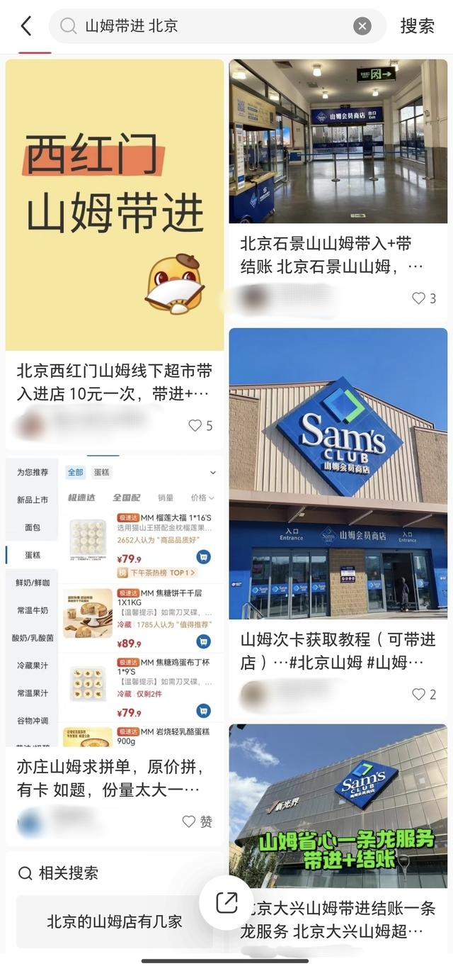 线下带人进店的模式更适合想现场打卡、亲身感受购物氛围的人。在社交平台上,这类服务已经发展为“一条龙”式服务:按人头收费,约5元一人。卖家带人进店,购物结束后卖家出示会员卡结账,买家随后将款项转账给卖家。此外,在二手交易平台上,还有人售卖“升级版”的山姆一次性进店体验卡。这类卡的价格在十几元到二十几元不等,卖家称这种卡绑定买家的手机号后,买家就可以自己进店购物了。
