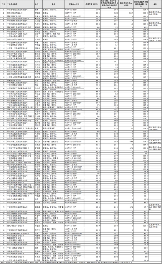 表:2023年97家央企“一把手”薪酬收入情况