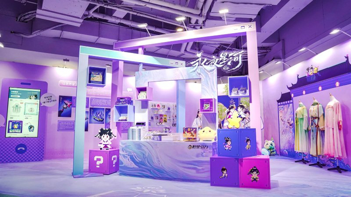 日前,《永夜星河》与小红书谷子展合作,在上海静安大悦城举办快闪展览,吸引许多剧粉排队打卡。整个展厅被布置成《永夜星河》的标志性蓝紫色调,展出剧中人物戏服、主角立牌、标志性的像素人卡通形象,以及各式各样的IP周边衍生品,粉丝可以现场DIY专属徽章,与同好交流与剧集有关的一切。