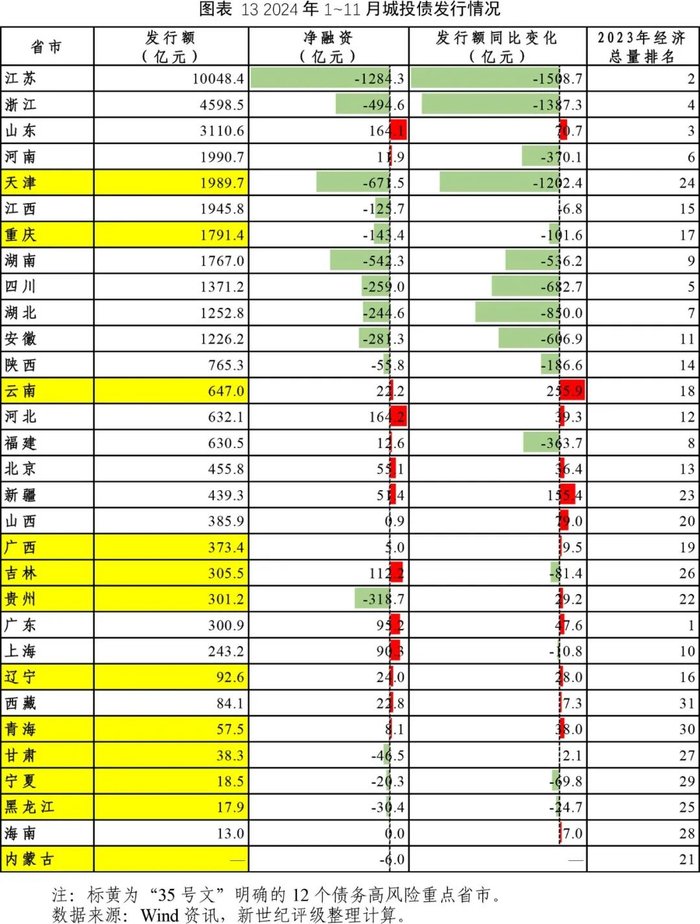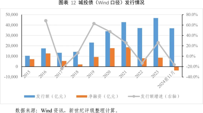 近年来,地方政府债务风险防控持续推进,城投企业的融资职能在逐步弱化和剥离,处置城投企业存量债务风险的政策不断出台,继“35号文”“47号文”之后,2024年进一步推出了“14号文”“134号文”“150号文”。在化解存量风险的同时,城投企业债券融资严控新增,大多只能借新还旧,2024年1~11月城投债(Wind口径)发行3.69万亿元,同比下降16.3%,净融资为净偿还3,684.5亿元,为历史首次年度净偿还。