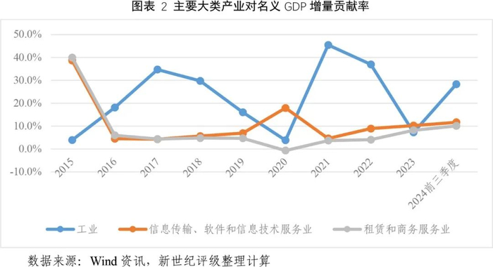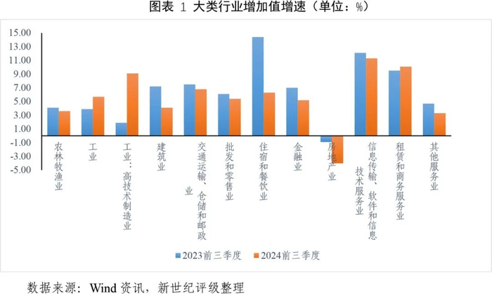 2024年,加快发展新质生产力作为政府经济工作的首位任务,为高技术产业的发展提供了良好的政策环境,工业中高技术制造业1~11月的增加值增速较上年同期大幅提升6.7个百分点至9.0%,信息传输、软件和信息技术服务业,租赁和商务服务业增加值增速也保持两位数的快速增长,高技术产业中制造和服务的生产活动增长均较为强劲。同时,在高技术产业带动下,前三季度工业对GDP增量的贡献率由上年的7.3%大幅提升至28.3%,信息传输、软件和信息技术服务业,租赁和商务服务业的贡献率均超两位数,分别为11.7%和10.1%,且较上年有所提高,在所有大类产业中贡献率属于较高水平。整体上,高技术产业对经济增长的拉动作用有所提升。