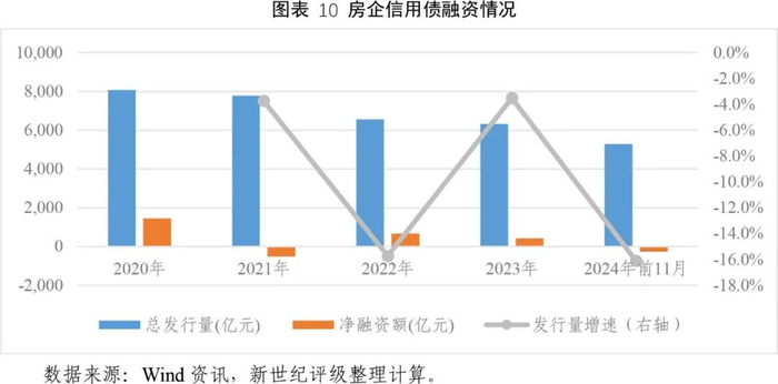 具体到债券融资方面,2024年房企信用债(Wind口径、包含证券化产品)融资再度收缩,1~11月发行规模延续下降态势且同比降幅由上年的3.5%扩大到16.1%,净融资转为净偿还260.1亿元,而上年同期为净融入471.6亿元。房企债券融资再度收缩,最重要的原因是地产需求低迷,地产企业开工不足导致融资需求下降,其次是地产企业的信贷融资环境友好,如“白名单”和城市房地产融资协调机制,信贷融资对债券融资形成了一定的替代效应。