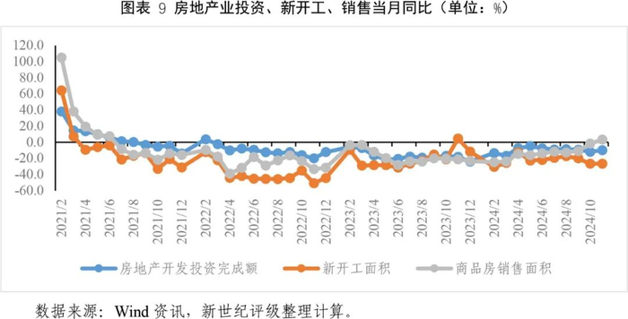 为应对房地产业的下行压力,2024年初开始,我国的稳地产政策不断出台,但效果均不太理想,房地产销售、投资和新开工数据均持续大幅度下降,直至2024年10月稳地产政策进一步升级,推出“四个取消、四个降低、两个增加”组合拳、基调转变为“促进房地产市场止跌回稳”后,我国房地产业的下滑势头才开始有所转变,商品房销售面积的降幅大幅收缩,并在11月实现当月同比正增长3.25%,为2021年以来连续37个月同比下降后的首个正增长;而房地产投资和新开工面积的改善尚不明显,1~11月累计同比大幅下降10.4%和下降23.0%,政策的成效仍有待显现。
