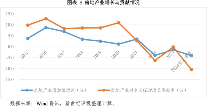 2024年,我国房地产业延续了下滑态势。前三季度房地产业增加值同比下降4.0%,降幅较上年同期扩大3.1个百分点;对名义GDP增量贡献率由上年的-0.1%大幅扩大到-10.3%,给经济带来的拖累显著加深,若扩大到整个地产链,如上游建材类(水泥、钢材和玻璃等)和建筑与工程类(建筑设计、建筑器械、工程服务等)以及下游家装装饰等,房地产业对经济的拖累幅度可能更大。