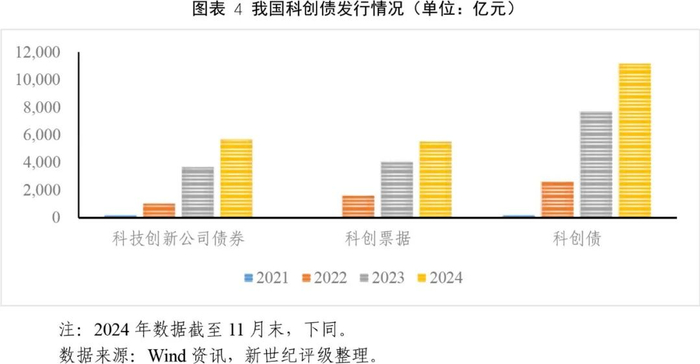 2024年,我国科创债(包含科技创新公司债券和科创票据)等金融产品对新质生产力的发展提供了有力支持。2024年1~11月,科创债累计发行11,165.9亿元,同比大幅增长59.9%。
