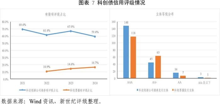 信用评级方面,自2021年取消强制评级后,整个市场信用债进行债项评级的比例逐渐降低至较低水平,在科创债领域,沪深交易所要求发行用途类科技创新公司债券的科创投资类发行人主体或债项评级AA+及以上、科创孵化类发行人主体评级AA+及以上,这一要求可能对市场评级行为产生了影响,导致进行债项评级在科技创新公司债券和科创票据间分化特别明显。2024年,科技创新公司债券进行债项评级的比例高达59.4%,若剔除私募债,比例提升至66.3%,而科创票据进行债项评级的仅16.67%(不含ABN,因ABN优先级全部有信用评级)。发行主体级别分布方面,科技创新公司债券和科创票据发行主体的信用等级均较高,2024年AA+及以上的比例分别达90.6%和91.9%。