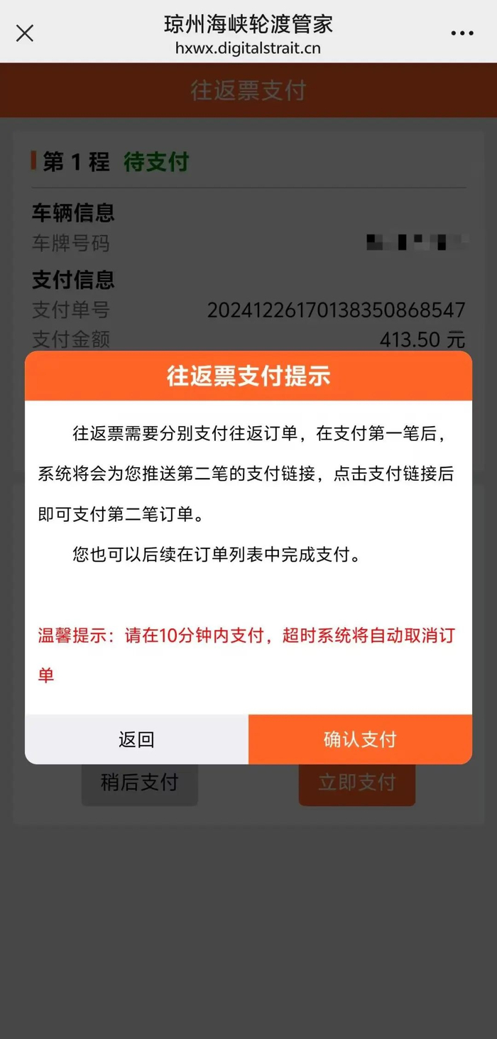往返船票需分两次支付,成功支付一笔船票费用后,系统会通过“琼州海峡轮渡管家”服务号给您推送支付提醒通知,点击通知进去即可支付另一笔船票费用。