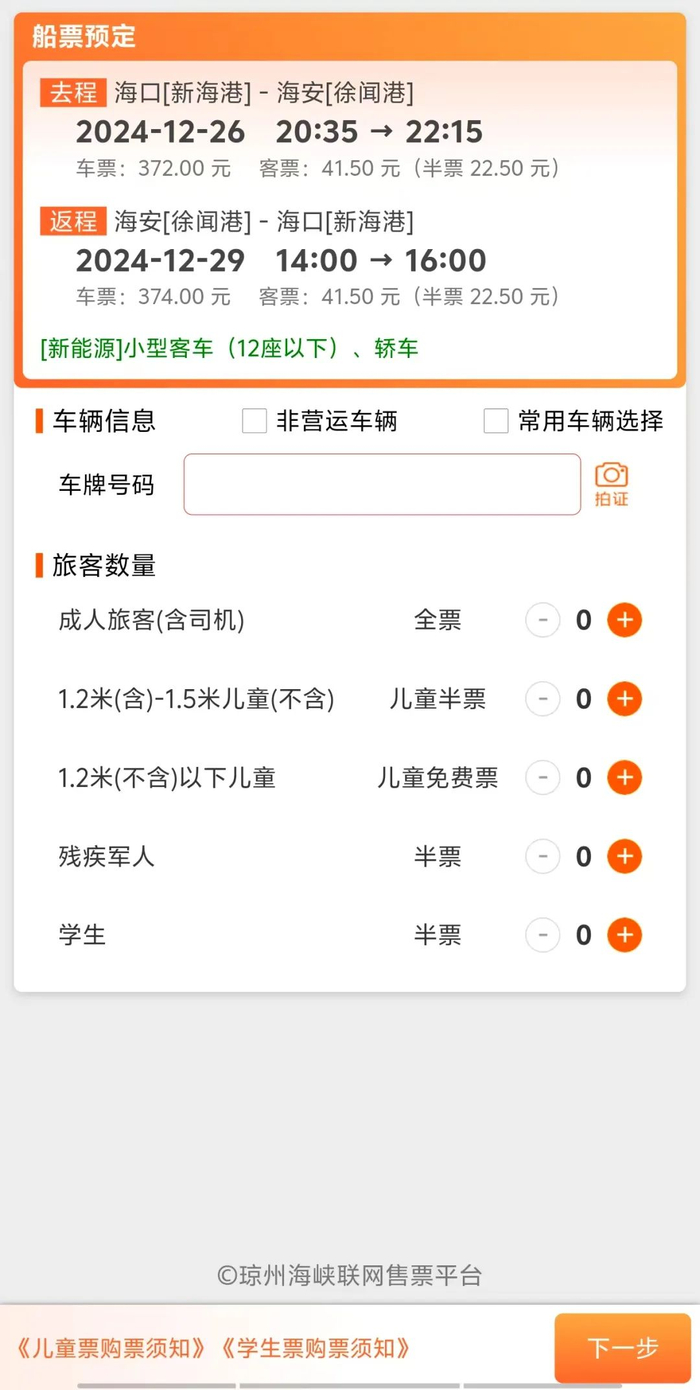 在“新海港”公众号,点击“购票服务—预约购票”;或“琼州海峡轮渡管家”公众号,点击“航班服务—船票预订”,即可看到升级后的购票页面。