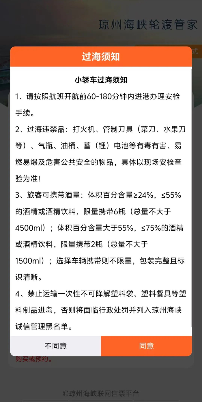 现在以7座新能源小车为例子为大家展示购票流程。选择完票类后点击查询按钮,会弹出过海须知,请仔细阅读。