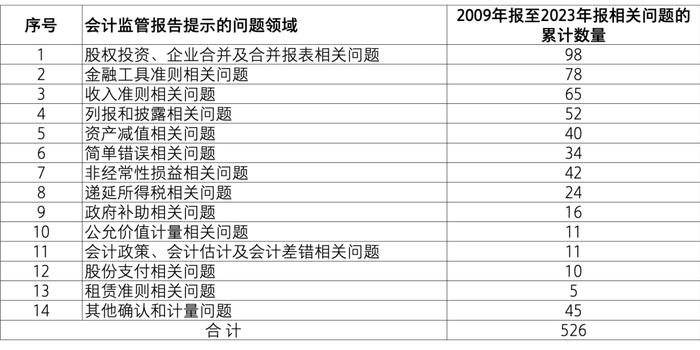 回顾证监会发布的上市公司2009年报至2023年报会计监管报告内容,部分上市公司对准则理解和执行不到位的问题涉及领域比较集中,其中,长期股权投资、企业合并及合并报表相关问题涉及最多,其次是金融工具和收入准则相关等问题,2009年报至2023年报相关问题涉及数量汇总如下(按照集中度排序):