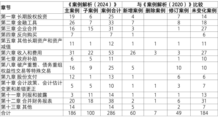 《案例解析(2024)》共涉及286个案例(包括:主案例186个、子案例100个),与上版《上市公司执行企业会计准则案例解析(2020)》(以下简称《案例解析(2020)》)相比,本版新增60个案例、删除7个案例、修订49个案例。新增案例中,收入章节变化最大,其次是长期股权投资与企业合并及金融工具章节。主要变化具体如下:
