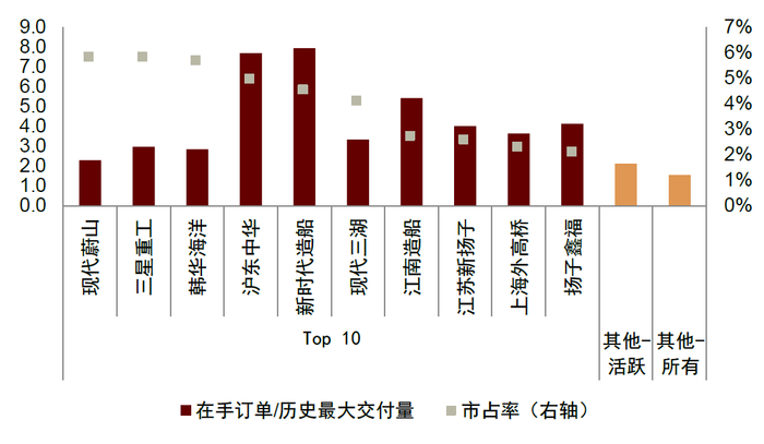 图表18:全球头部十大船厂的在手订单占历史最大交付量比与其他船厂存在显著差异(截至2024年11月)