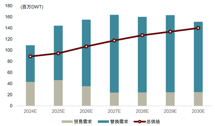 ►需求端:我们综合考虑替换需求和贸易需求,其中,针对替换需求,我们假设24年以上的船队就需要被替换,且考虑环保要求弱约束、即当船队进入老龄化后才会被替换为绿色船型,未来几年,替换需求的占比有望持续提升。