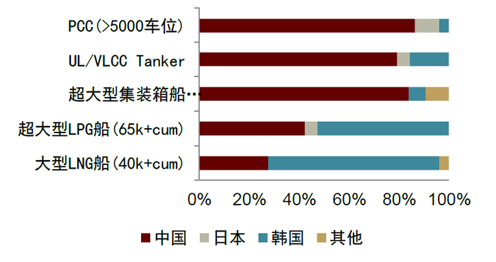 三国造船业船型结构存在差异,往前看,船型高端化趋势下中国主要面临与韩国的激烈竞争。中国和日本在造船市场上的竞争,是常规船型的价格和质量竞争,而中韩两国的竞争,主要集中于高附加值船型。