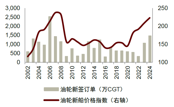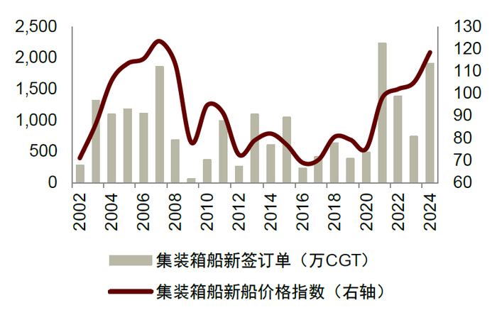 2021年后民用造船业进入新一轮周期,2024年价量双升。2020年底,新造船价格指数及新签造船订单同比开始回暖,新船价格指数进入上行通道。2022-23年,头部船厂在手订单接近饱和、产能供给不足,船厂挑单导致新船价格继续上行、订单量在高基数下同比有降。2024年,部分船厂开始小规模扩产或重启产能,同时船价持续攀升背景下、航运公司抢占船厂排期,2024年造船新签订单量价齐升。根据Clarkson,2024年全球新接订单量6,581万CGT/1.68亿DWT,同比增长33.8%、31.3%,新签订单金额2,038亿美元,同比+55.2%;2024年末新船价格指数攀升至189.16,同比增长6.06%(前期高点为2008年9月的191.58)。