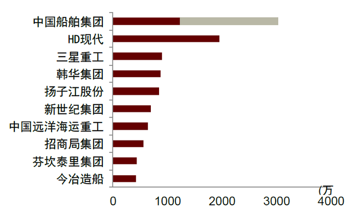注:中国船舶集团中红色部分为中国船舶公司数据(12472CGT,统计口径为四家控股子公司,不包含黄埔文冲),灰色部分为中国船舶集团其余船厂数据(17333CGT)