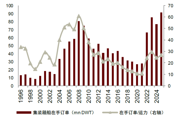 2024年,集装箱船运价处在较高水平,我们测算大型集装箱船回本周期可缩短至3年以内,催生集装箱船订单超预期增长,使得手持订单/运力比例提升,但距离历史高位仍有较大差距,并未显著供过于求。