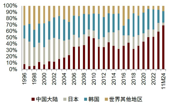 图表26:中日韩高端船型在手订单占比(截至2024年11月)
