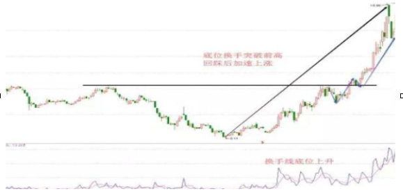 如下图所示:股价创新低后换手率(换手线HSL)并未上升,在拉升过程中明显呈高换手现象,此时主力正在进场。至前期高点附近时盘整回踩,之后加速上涨。