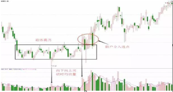 如下图所示,该股开始箱体震荡,跌破箱体时放量,主力抄底意愿强烈。第一次突破时同样放量。红圈处是散户介入的时点。