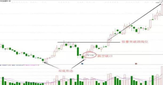 如下图所示,形成双底技术形态后,向上跳空高开,量能放大。突破双底颈线位后,走势不再犹豫,轻松上涨。