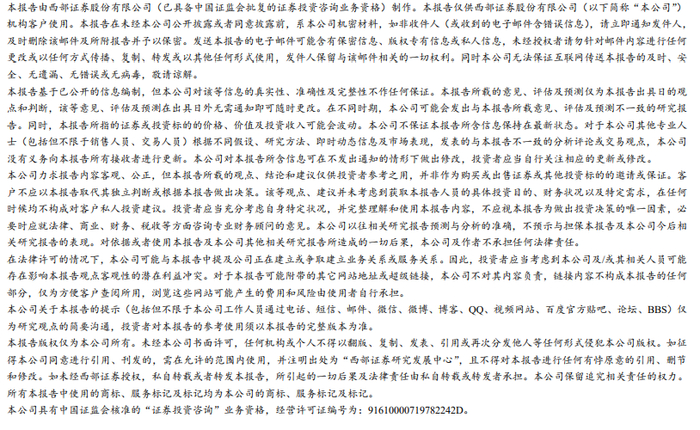 本公众号版权仅为西部证券所有。未经公司书面许可,任何机构或个人不得以翻版、复制、发表、引用或再次分发他人等任何形式侵犯本公众号版权。如征得西部证券同意进行引用、刊发的,需在允许的范围内使用,并注明出处为“西部证券研究发展中心”,且不得对本公众号进行任何有悖原意的引用、删节和修改。如未经西部证券授权,私自转载或者转发本公众号,所引起的一切后果及法律责任由私自转载或转发者承担。西部证券保留追究相关责任的权力。本公司具有中国证监会核准的“证券投资咨询”业务资格,经营许可证编号为:91610000719782242D。