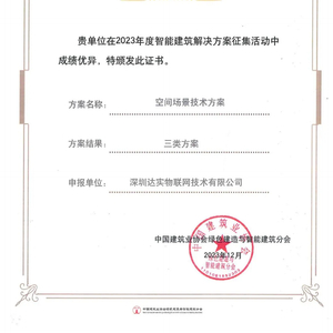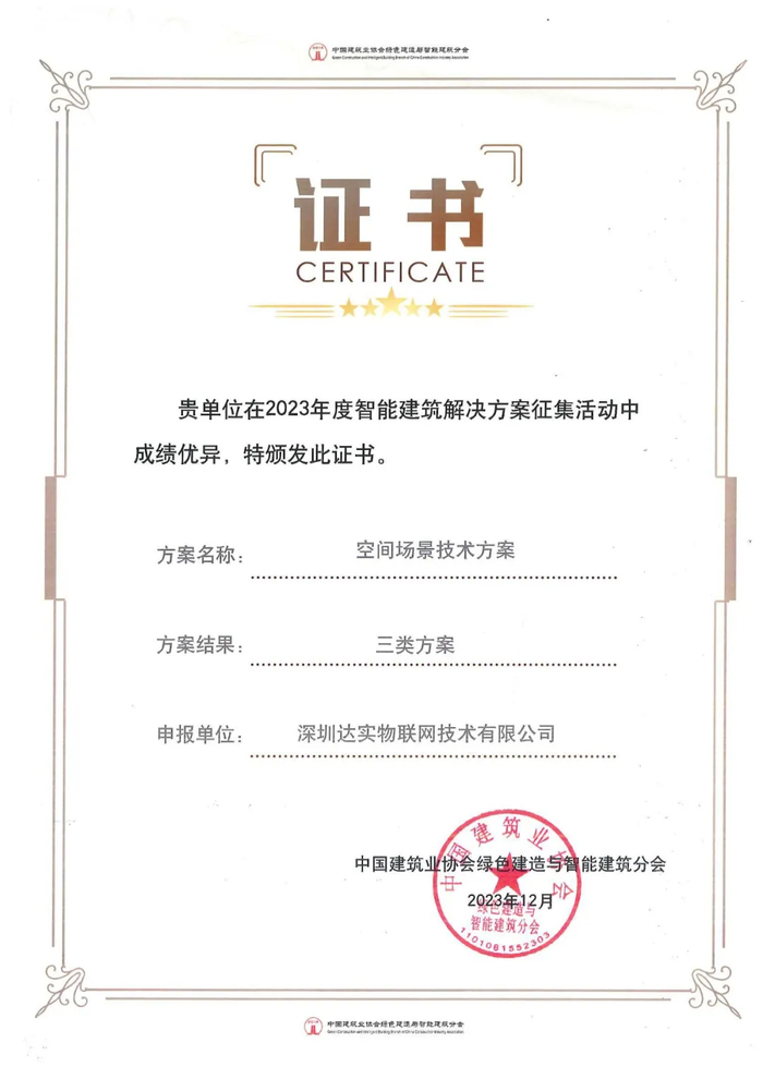 中国建筑业协会绿色建造与智能建筑分会在业内开展了智能建筑解决方案征集活动。达实空间场景控制系统解决方案凭借其“强体验、快部署、低成本”的优势从众多方案中脱颖而出,荣获优秀解决方案奖!