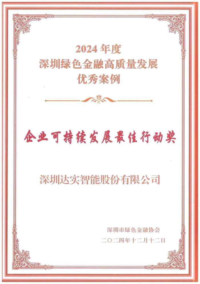 2024年12月12日,金融支持经济社会绿色转型主题培训暨深圳市绿色金融协会 2024 年度活动在达实智能大厦举办,达实智能荣获2024年度深圳绿色金融高质量发展优秀案例“企业可持续发展最佳行动奖”,彰显了达实智能在节能及绿色金融方面的努力和付出。