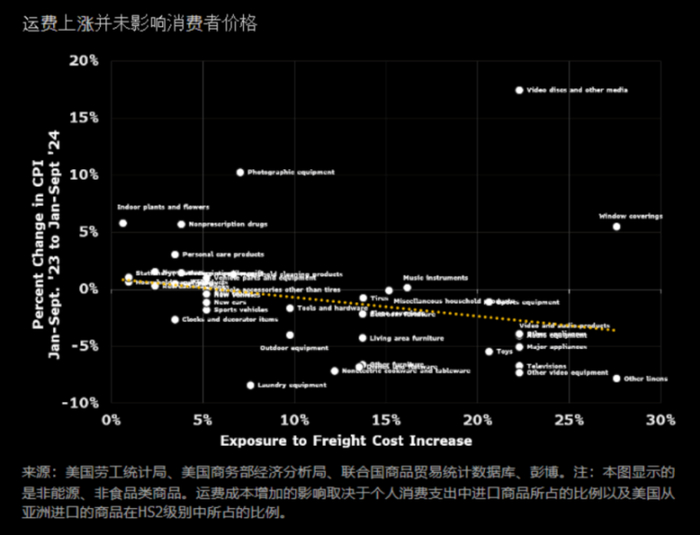 第三,与直觉不同,提高关税对美国经济的最初影响可能是公司利润率和投资的减少,对消费者价格的影响反而较小。另一方面,根据彭博经济研究,有个可比的有趣的自然实验——2023年12月至2024年7月期间,亚洲和北美航线集装箱运费上涨了一倍左右,导致进口成本上升了1—2.5个百分点,覆盖了关税上涨导致成本上涨约1.8%的范围,但可以看到,运费上涨并未影响消费者价格。这是因为,零售商和生产商的定价能力在大大减弱,难以将成本转嫁给消费者。因此,如果公司选择降低利润率,公司股价就会受到冲击,股票反而比实体经济更容易受到关税的影响。