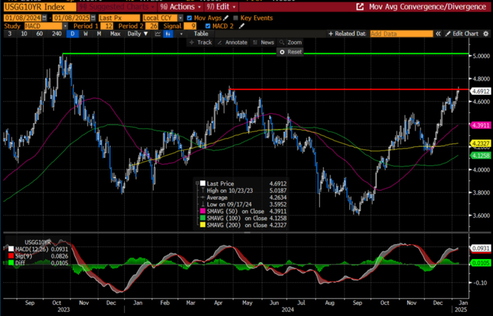 有鉴于此,基准10年期美国国债收益率在新总统任期第一年易上难下,但上方空间相对明确。下方以2年期美国国债收益率点位为支撑,看4%作为支撑位。上方第一阻力位看4.5%(注:该点位已到,本文初作于20241129,点位预判无改动),若能实质性突破4.5%关口,则有动力上探4.7%和5%的水平。