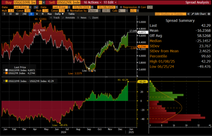 整体来看,无论是降息周期继续,还是可能强劲的发行压力和期限溢价,均应继续保持曲线趋陡的核心假设(注:本文写成与2024年11月底时,基准10年期美国国债收益率与2年期美国国债收益率之差在近0水平,截至目前已大幅趋陡至42个基点,因此上方空间现在有限了),至于是牛市趋陡还是熊市趋陡则取决于通胀水平和相应的美联储降息步伐。虽然2024年12月以前曲线形态随着特朗普交易的获利平盘和止损交易而多有反复,数次重新扁平,但在大周期中应该不改长期走势。风险在于如果通胀压力大幅上升,美联储重回加息周期,那么曲线形态将改变为熊市趋平。