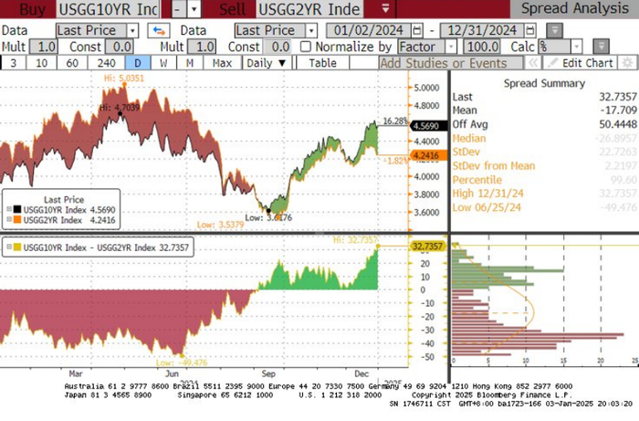 2024年,基准10年期美国国债收益率年内开于3.9238%,最高于4月25日触及4.7351%,最低于9月17日触及3.5952%,截至12月31日,收于4.5690%;2年期美国国债收益率年内开于4.2849%,最高于4月30日触及5.0434%,最低于9月25日触及3.5000%,截至12月31日,收于4.2416%。从曲线形态上,美债收益率曲线在降息预期中的趋陡并非一蹴而就,先后经历了趋陡、趋平、横盘、再趋平、急速趋陡回正并延续陡峭化走势、又转而两次趋平至近0、最终在年底重新急速趋陡的过程,基准10年期美国国债与2年期美国国债收益率利差最平倒挂49.5个基点,最陡在年底追到了32.7个基点。市场呈现主题快速变换和高波动性的特征,与量化宽松时期的平稳不可同日而语。
