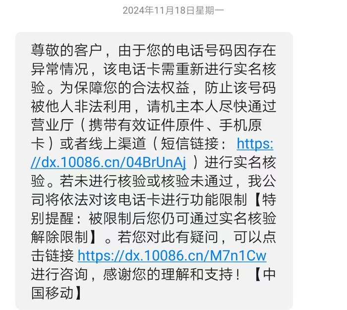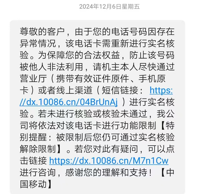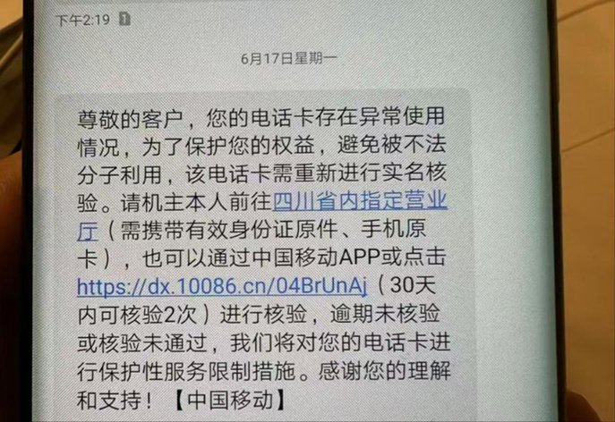 据李先生表示,他使用四川移动某手机卡已经7年多,并经过实名认证,且一直正常交费。2024年6月17日,他发现自己的电话号码突然无法正常使用,并收到来自中国移动的短信,提示李先生电话卡存在异常使用情况,为保护用户权益,避免被不法分子利用,需重新进行实名核验。并建议可以前往四川省内指定营业厅,也可以通过中国移动APP或中国移动网站进行核验,而逾期未核验或核验未通过的,移动将对电话卡进行保护性服务限制措施。