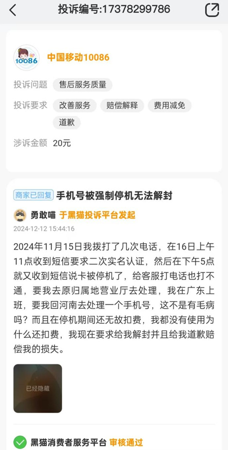 “一年之内手机号三次被强制停机并要求实名核验,但始终未说明具体原因,严重影响了我的正常生活”。近日,消费者李先生表示,2024年,他曾三次被中国移动强制停机,并被要求进行实名核验。他就此多次致电四川移动,要求说明被强制停机的原因,但对方却始终语焉不详。