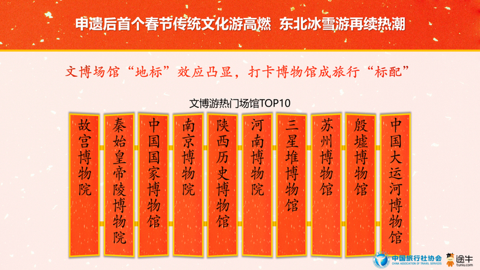 2024年春节申遗成功,显著激发了大家对中国非物质文化遗产的热情与关注。《报告》显示,春节期间,非遗民俗文化、非遗手工技艺等体验活动展现出了极高的人气,成为游客的热门选项。其中,北京庙会、潮汕英歌舞、广东醒狮、闽南游神、西北社火等独具地方特色的非遗民俗活动,以及簪花、扎染、剪纸、宣纸、漆扇等充满创意与匠心的非遗手工技艺体验吸引了众多游客。博物馆“地标”效应愈发凸显,故宫博物院、秦始皇帝陵博物院、中国国家博物馆、南京博物院、陕西历史博物馆等继续成为游客热门景点。各种设计新颖、贴合年轻人审美的博物馆文创产品,为游客带来了更加丰富多元的文化体验。