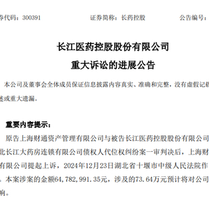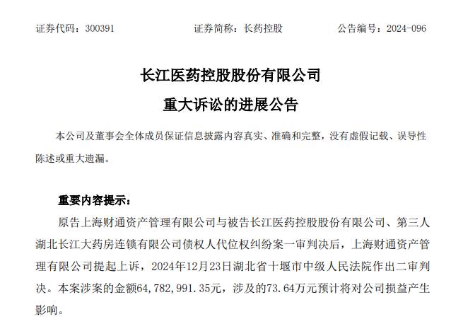 近日,长药控股(300391)发布重大诉讼进展公告,原告上海财通资产管理有限公司(下称“上海财通”)与被告长药控股、第三人湖北长江大药房连锁有限公司(下称“长江大药房”)债权人代位权纠纷案2024年12月23日作出二审判决。长药控股于判决生效之日起十五日内在长江大药房对长药控股享有的到期债权1.55亿元范围内向上海财通清偿判决确认的长江大药房的还款义务。本案涉案的金额6478万元,涉及的74万元预计将对公司损益产生影响。