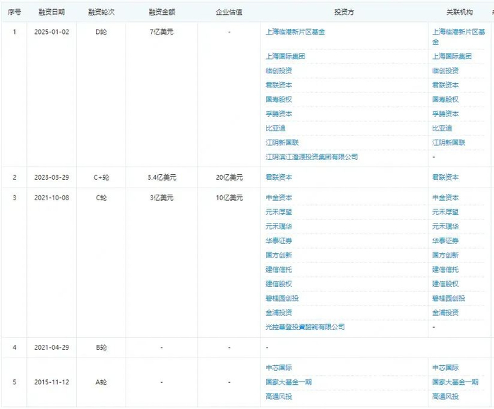 公司分别于2015年11月和2021年4月拿到了A轮和B轮融资,这两轮融资均未透露具体的融资金额,中芯国际也参与其中。