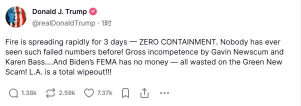 当地时间9日早,特朗普继续猛烈抨击纽森和拜登政府:“火势已经迅速蔓延了3天,但仍然零控制。从来没有人见过这样失败的数字!纽森严重无能……拜登的联邦应急管理局没有钱,全都浪费在绿色骗局上了!洛杉矶彻底完蛋了!!!”