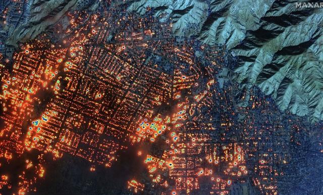 当地时间8日上午10:45卫星图像显示,山火导致洛杉矶阿尔塔迪纳西部地区陷入一片火海