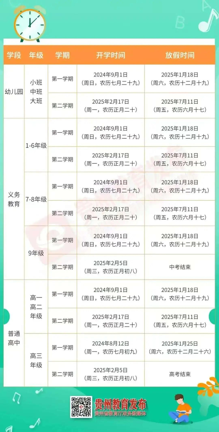 2025贵州中小学期末考试、放假及开学时间