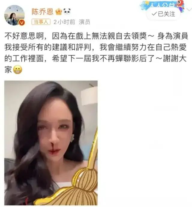 上一届获得最令人失望的女演员奖项的陈乔恩也曾发文回应,坦然接受这一奖项。