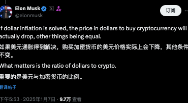 当地时间周二,在评论YC首席执行官Garry Tan的帖子“如果马斯克的‘政府效率部’能够减少政府开支,狗狗币的价格将会上涨”时,世界首富直白地表示,如果美元通胀的问题得到解决,其他条件不变,那么购买加密货币的美元价格实际上会下降。