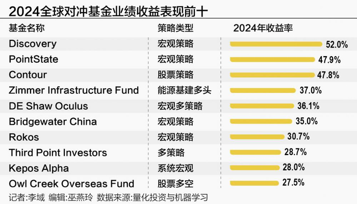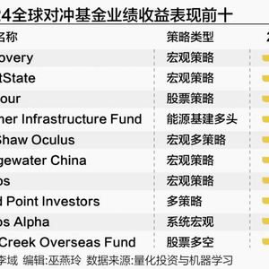 来自量化投资与机器学习的最新数据显示,Discovery以2024年收益52%拔得头筹。PointState和Contour则以47.9%和47.8%的收益率夺得年度亚军和季军。Zimmer Infrastructure Fund、DE Shaw Oculus等排名前十。
