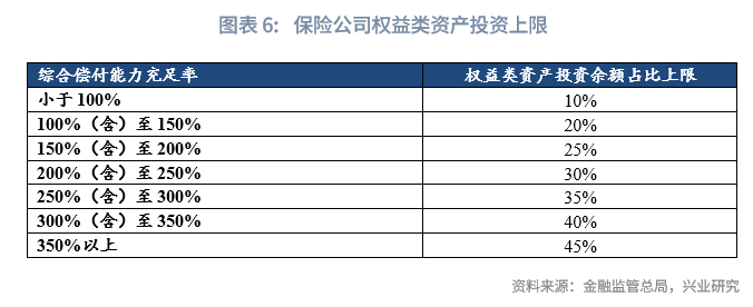 根据2020年7月原银保监会发布的《关于优化保险公司权益类资产配置监管有关事项的通知》,不同偿付能力的保险公司开展权益类资产配置拥有不同的比例上线。其中,对于综合偿付能力充足率为350%以上的保险公司,其可以配置的权益类资产占比最高,权益类资产余额将可达到该公司上季末总资产的45%。