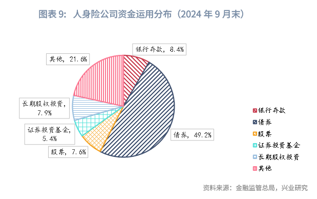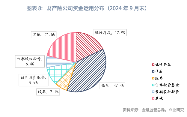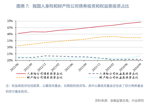 从我国保险公司实际来看,截至2024年9月末,财产险公司、人身险公司整体的综合偿付能力分别为231.8%、188.9%,对应的权益类资产占比上限分别为30%和25%。然而从实践中来看,财产险公司和人身险公司配置的股票、公募投资基金、长期股权投资总规模分别占其总资产的23.4%、20.9%。应当指出的是,保险公司投资的公募投资基金还包含了大量的债基和货基。由此可见,我国保险公司投资权益资产仍大有可为。