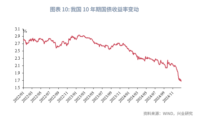 应当指出的是,对于保险公司而言,开展股权投资同样有助于其缓解“资产荒”、应对利差损风险。在2024年12月27日人民银行发布的《中国金融稳定报告(2024)》中,人民银行指出当前我国人身险公司面临利差损风险。截至2024年3季度末,财产险公司、人身险公司投资于债券的资产占比分别为37.3%、49.2%,而在我国债券收益率持续下行的背景下,十年期国债收益率目前已下降至1.6%水平附近,保险公司利差损风险也随之提高。在此背景下,通过开展股权投资、向政府投资基金进行出资将可以在一定程度上提高保险资金的收益率,从而应对利差损风险。