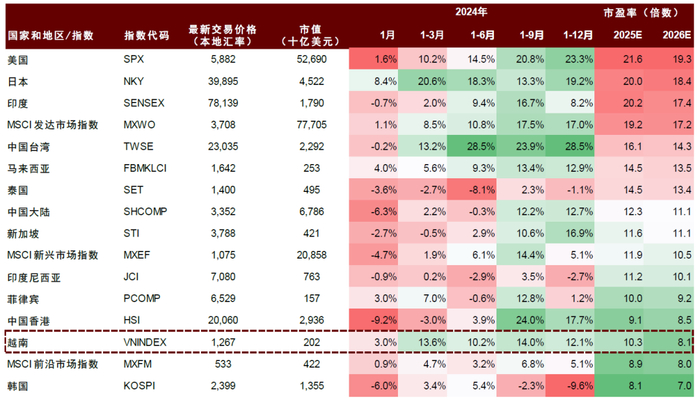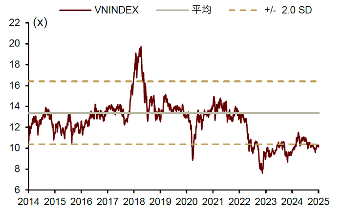 截至2024年12月31日,越南指数(VNINDEX)的动态平均市盈率倍数为10.1倍左右,低于10年中枢两个标准差。根据彭博一致预期,2025年和2026年越南前瞻市盈率则为10.3倍和8.1倍。我们认为当前越南资本市场的估值偏低,结合未来几年宏观环境的复苏估值水平具备吸引力。