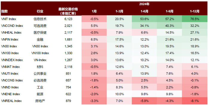 ► 消费可选:根据Haver,2024年越南零售交易同比增长9%,考虑到GDP增速为7.1%,通胀率约为4-4.5%,我们认为整体消费板块增速不高,并主要依靠外需游客消费驱动,而非内需增长,该板块增长由个别头部连锁零售企业市场份额集中化和快速拓店驱动。我们认为,消费板块有望在2025年由外需消费,转变为内需消费驱动的增长,主要催化剂包括:1)针对部分商品和服务2%的增值税减免政策[1],进行第三次期限延长,并延长至2025年6月30日;2)4Q24通胀逐步缓解致3%以下水平;3)最低工资标准从2024年7月1日起上调约6%及对公务员薪资上调30%等。